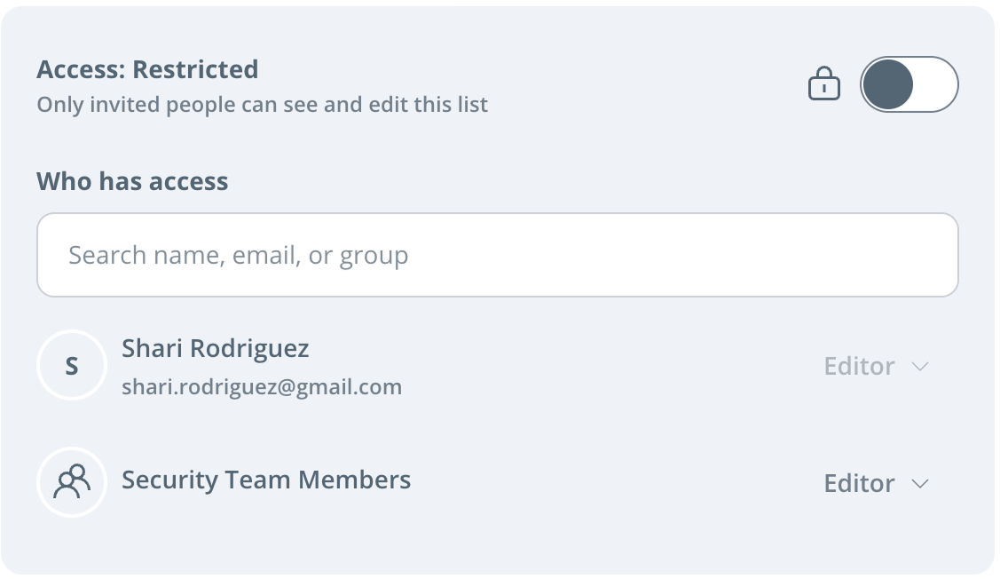 Figure 4: Organizations can also assign access to different People Lists to specific teams (i.e., groups of users), in addition to individuals. In the case here, the administrator assigned access to the “Possible Inside Theft” People List to only the “Security Team Members” group.
