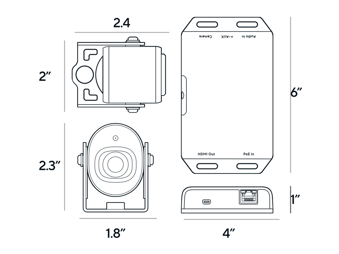 Unité principale de la caméra : H : 25,5 mm (1 po), l : 89 mm (3,5 po), L : 152 mm (6 po)