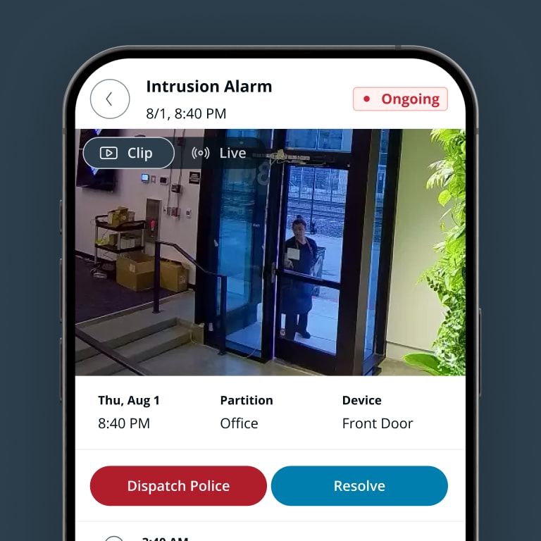 Découvrez exactement ce qui a déclenché l’alarme, affichez les flux vidéo en direct et résolvez ou envoyez la solution en un clic.