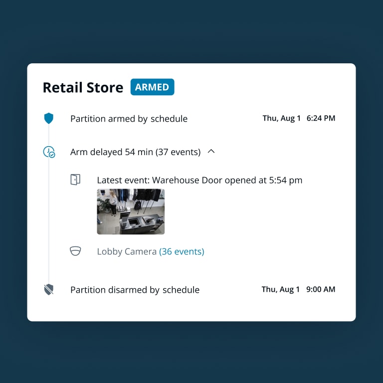 Supervisez le déroulement d’armement de tous vos sites depuis l’interface Web ou mobile de Command, et armez/désarmez à distance n’importe quel site/partition en un seul clic.