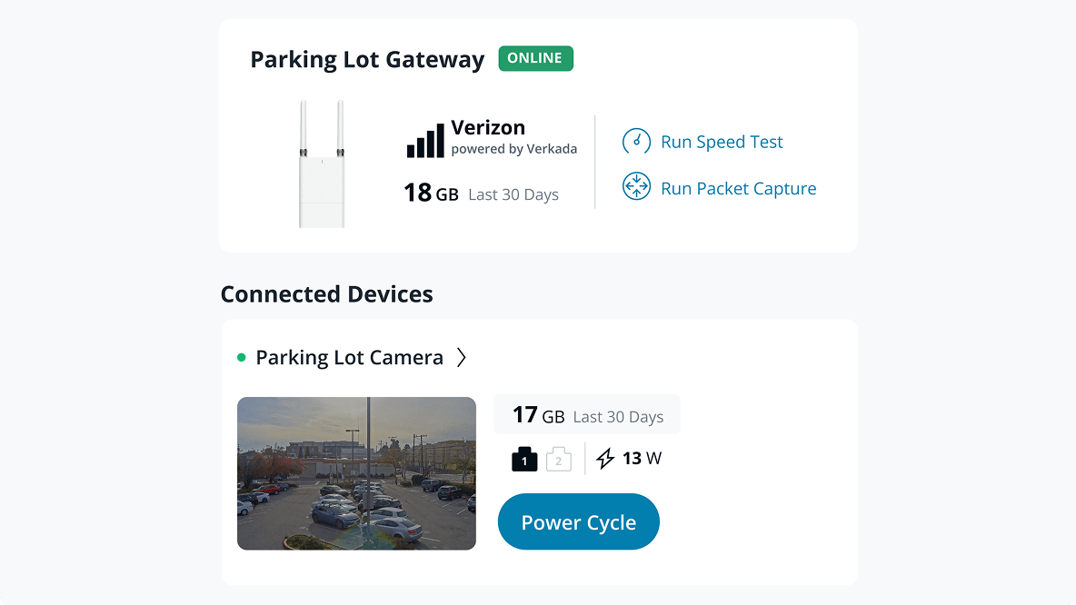 복잡한 설치나 네트워크 또는 IT 설정 없이도 빠르게 Verkada 장치를 온라인에 연결할 수 있습니다.