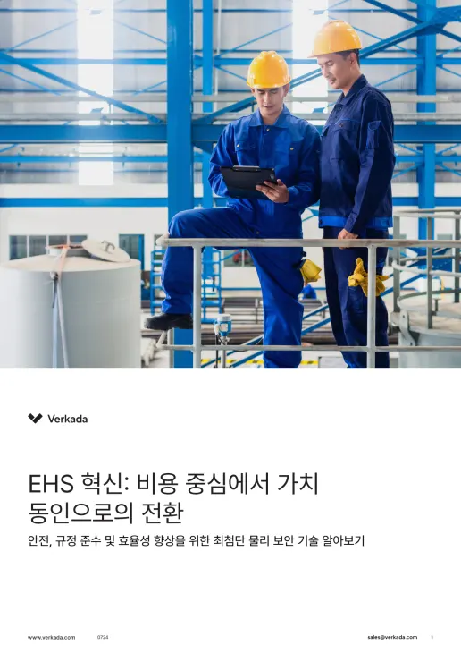 제조 업계는 안전성, 규정 준수 및 전체적인 효율성에 영향을 미치는 여러 과제에 직면해 있습니다. Verkada의 종합 가이드인 EHS 혁신: 코스트 센터부터 가치 동인까지는 EHS(Environmental Health and Safety) 프로그램을 전략적 비즈니스 이점으로 혁신하도록 지원하는 실행 가능한 인사이트와 첨단 기술 솔루션을 제공합니다.