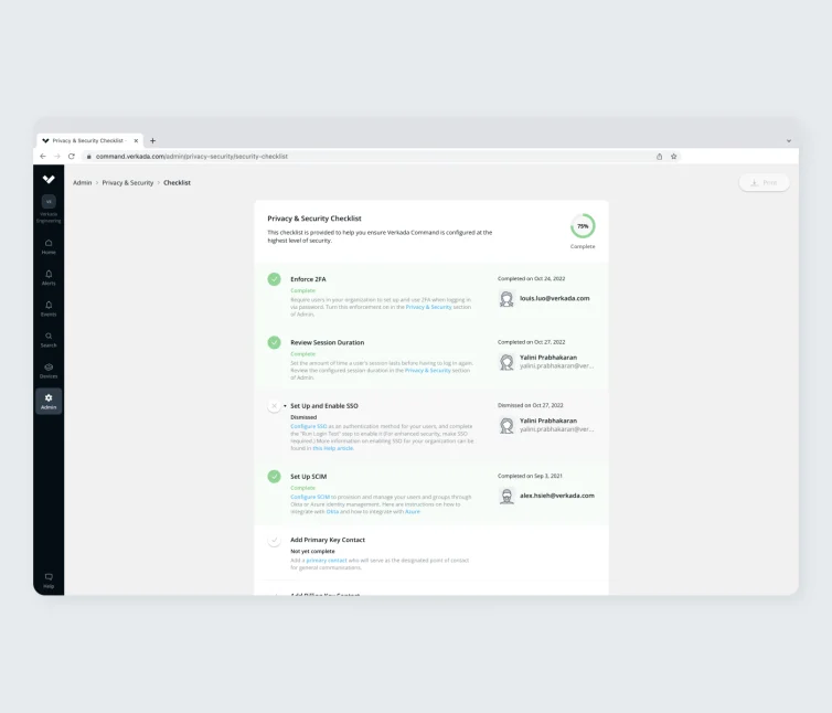 역할 기반 액세스, 세분화된 권한, 얼굴 흐림 처리, 개인정보보호 영역 등으로 개인 식별 정보(PII)를 보호합니다. Verkada Command 개인정보보호 및 보안 점검표로 모범 사례를 달성하세요.